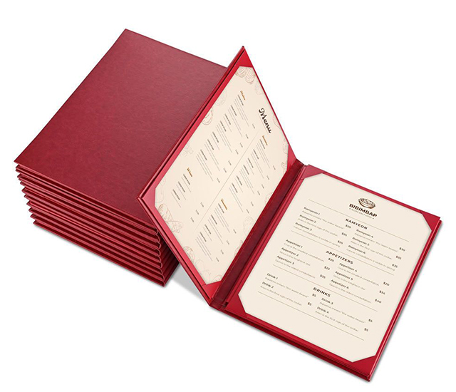 We provide high-end menu printing solutions using premium-quality paper, durable laminations, waterproof materials, synthetic sheets, leather bound covers, and custom sizes. We tailor-make menus that perfectly match your food concept and brand identity with luxury print options like matte, gloss, velvet finish, foiling, and spot UV. Long lasting durability, refined design, and flawless print clarity all combined, our menus will give your space a polished and premium dining impression.